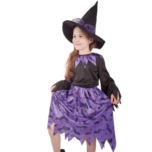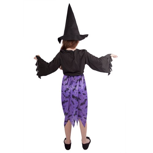 Roztomilý karnevalový kostým čierno-fialovej farby s motívom netopierov urobí radosť každému dievčatku! Súprava obsahuje šaty a klobúk s mašľou. Set vo veľkosti S je určený pre dievčatká vo vekovom rozmedzí 4-6 rokov (105-116 cm). Vhodný aj na oslavu Halloweenu! Metla ani palička nie sú súčasťou balenia.