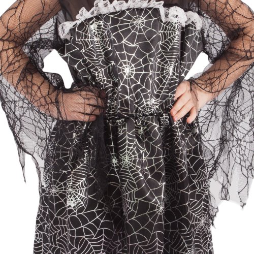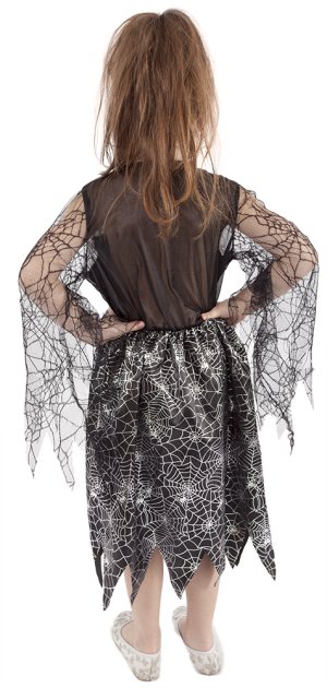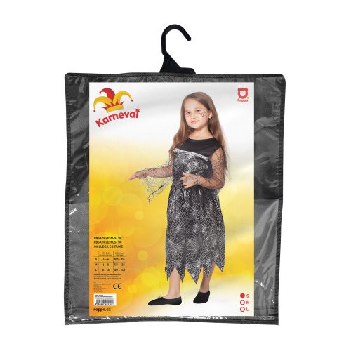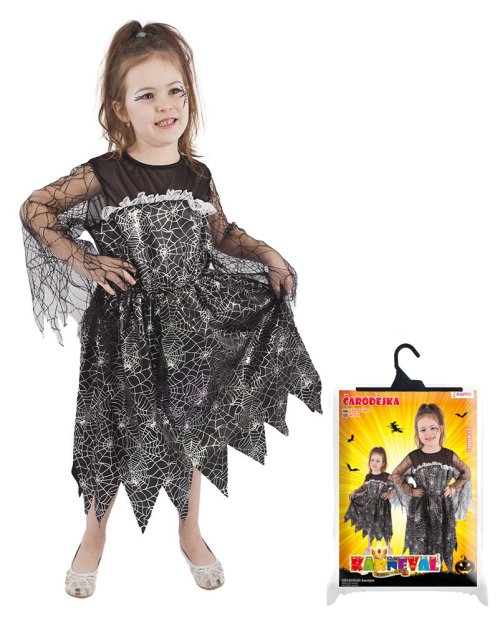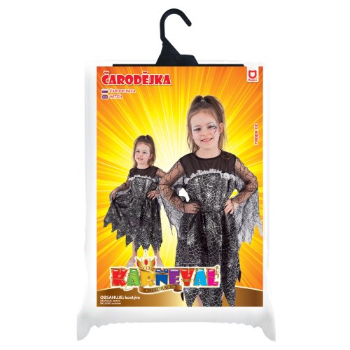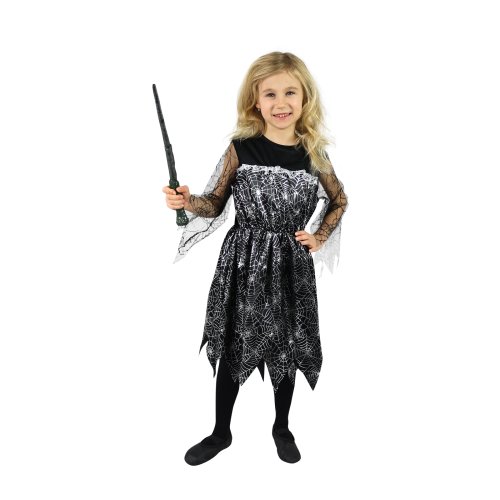 Magický karnevalový kostým pre malé čarodejnice! Kostým vo veľkosti S je určený pre dievčatká vo vekovom rozmedzí 4-6 rokov (105-116 cm). Čierne šaty sú dekorované striebornou pavučinkou. S týmto úchvatným kostýmom sa zaručene staneš hviezdou karnevalu aj Halloweenu! Metla ani palička nie sú súčasťou balenia.