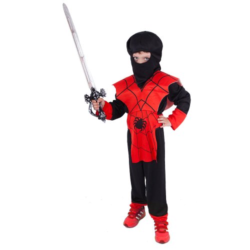 Karnevalový kostým NINJA vo veľkosti M je určený pre chlapcov vo vekovom rozmedzí 6-8 rokov (116-128 cm). Balenie obsahuje overal, vestu, kuklu, čelenku a opasok. Červené prvky kostýmu sú dekorované pavúkom a pavučinami.