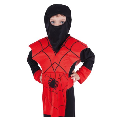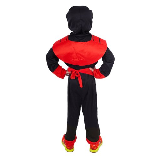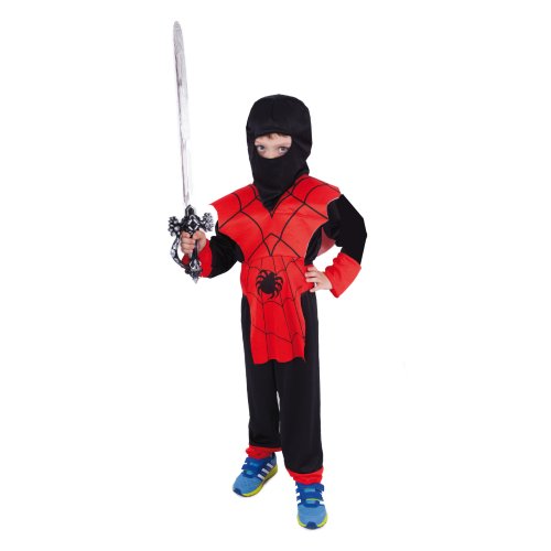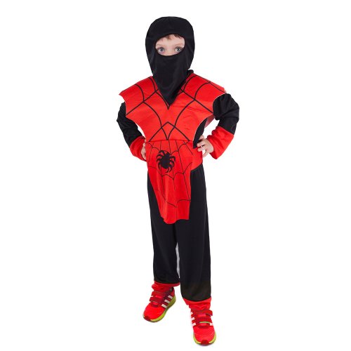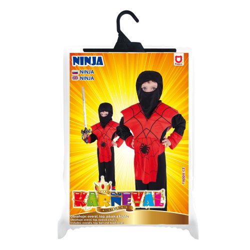Karnevalový kostým NINJA vo veľkosti S je určený pre chlapcov vo vekovom rozmedzí 4-6 rokov (105-116 cm). Balenie obsahuje overal, vestu, kuklu, čelenku a opasok. Červené prvky kostýmu sú dekorované pavúkom a pavučinami. Meč nie je súčasťou balenia.