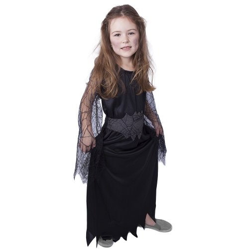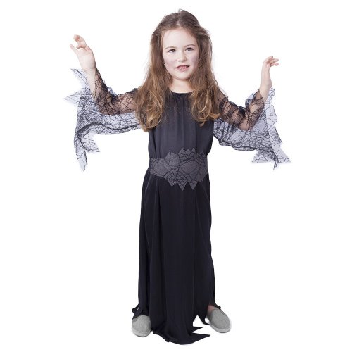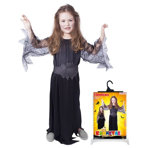 Kostým pre malé čarodejnice! Kostým čiernej farby vo veľkosti S je určený pre dievčatká vo vekovom rozmedzí 4-6 rokov (105-116 cm). Šaty sú dekorované priehľadnými rukávmi s motívom pavučín. S týmto úchvatným kostýmom budeš vyzerať ako pravá čarodejnica! Skvele sa hodí aj na oslavu Halloweenu!