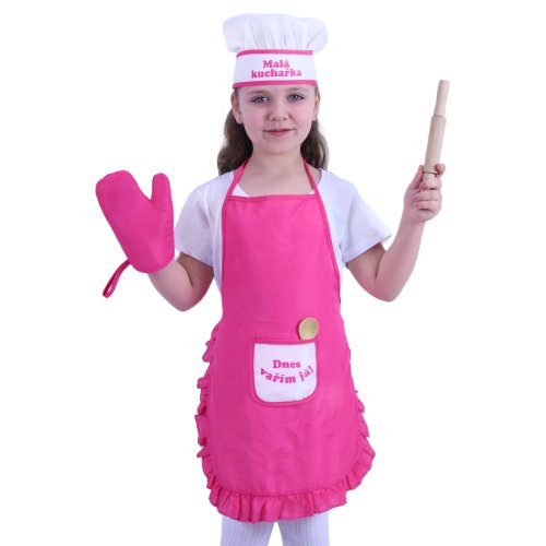 Kostým pre každú malú kuchárku! Ružová zástera so zaväzovaním okolo krku a pása, na ktoré je našité malé vrecko s českým nápisom Dnes varím ja! No a čo by to bolo za kuchárku bez parádnej kuchárskej čiapky a chňapky! Set je doplnený o drevený valček a varešku. Kostým je vhodný pre dievčatká vo vekovom rozmedzí 4-10 rokov (110-150 cm).