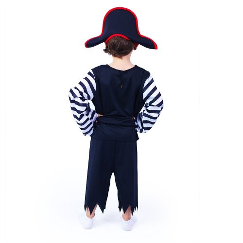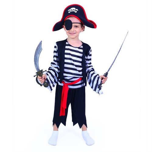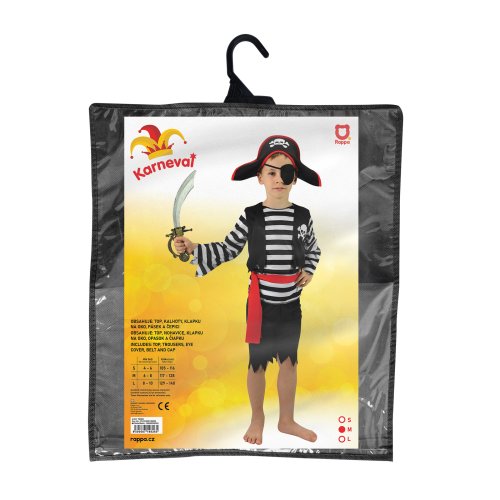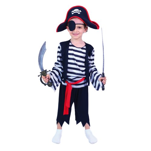 Karnevalový kostým, ktorý ťa premení na malého piráta! Kostým vo veľkosti M je určený pre chlapcov vo vekovom rozmedzí 6-8 rokov (117-128 cm). Balenie obsahuje horný diel, nohavice, opasok, klapku na oko a štýlovú pirátsku čiapku. Neobsahuje šabľu.