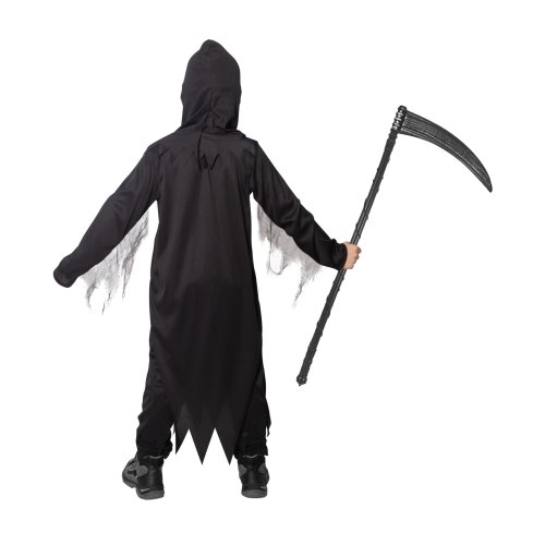 Strašidelný karnevalový kostým s motívom smrtky! Kostým vo veľkosti S je určený pre deti vo vekovom rozmedzí 4-6 rokov (105-116 cm). Balenie obsahuje čierny hábit s bielou potlačou kostry a kapucňu. Súčasťou kostýmu je reťaz. Neobsahuje kosu.