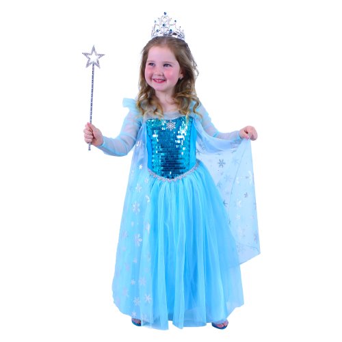 Očarujúce dievčenské kostým pre malé zimné princezné! Kostým vo veľkosti S je určený pre dievčatká vo vekovom rozmedzí 4-6 rokov (105-116 cm). Kostým je ušitý v tyrkysovo modrej farbe a je zdobený oslnivými flitrami a strieborným lemovaním. Súčasťou šiat je tiež plášť dekorovaný trblietavými snehovými vločkami.