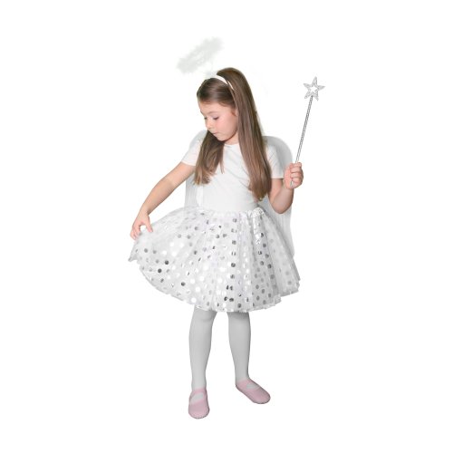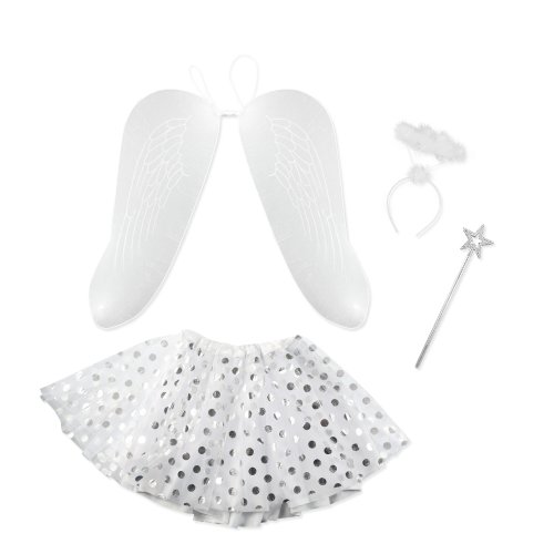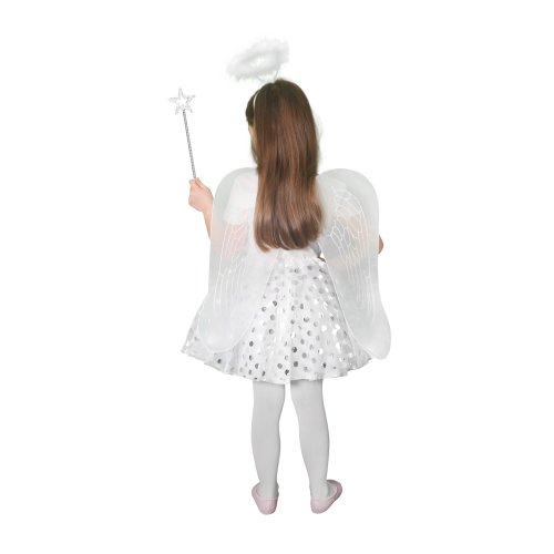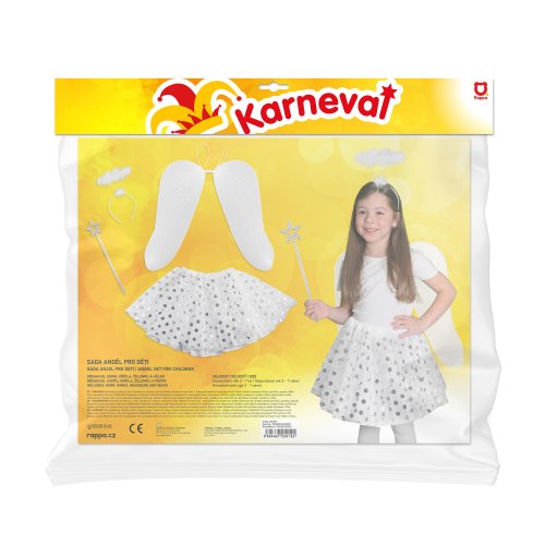 Roztomilá súprava pre všetky malé anjelikov! Kostým bielej farby je určený pre dievčatká vo vekovom rozmedzí 3-7 rokov. Balenie obsahuje nadýchanú sukničku zdobenú striebornými bodkami, perfektne zladené krídla, čelenku s perím a prútik.