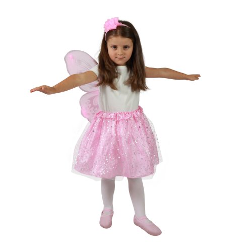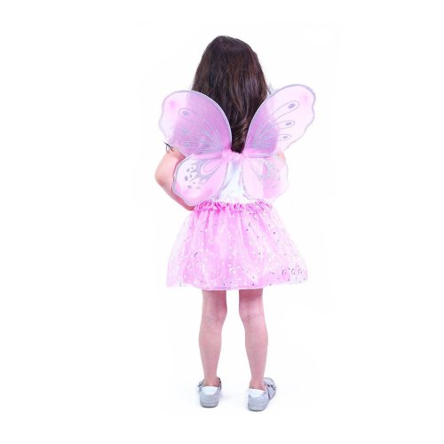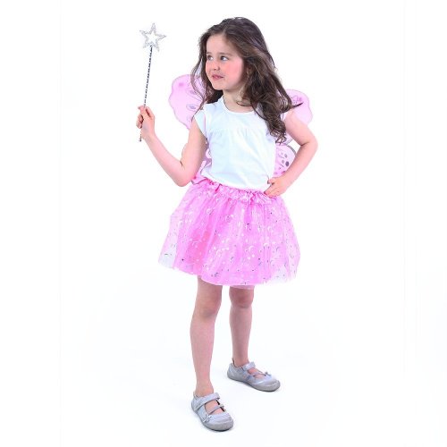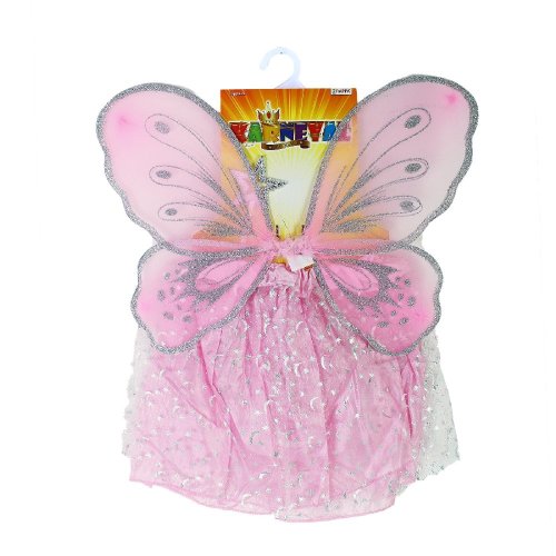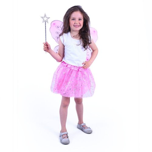 Krásna vília sada pre malé dievčatká! Sada obsahuje krídla so strieborným zdobením, ružovú TUTU sukienku so saténovým lemom a striebornou potlačou hviezd a nechtíkov. Celý set dopĺňa víli kúzelnícky prútik. Sukňa je dlhá cca 25 cm a je vhodná na obvod pása 44-72 cm.