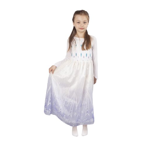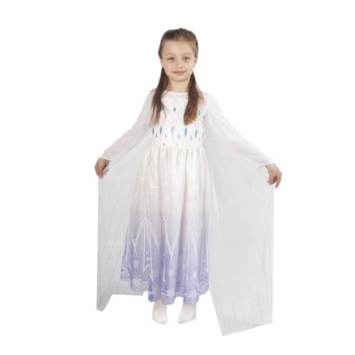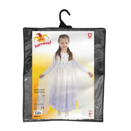 Úchvatný dievčenský kostým pre všetky zimné princezné! Dlhé šaty v bielej farbe sú v hornej časti zdobené flitrami, od pása dole je bielo-fialová tylová sukňa zdobená potlačou. Súčasťou šiat je tiež vlečka dekorovaná flitrami. Kostým vo veľkosti M je určený pre dievčatká vo vekovom rozmedzí 6-8 rokov (117-128 cm).