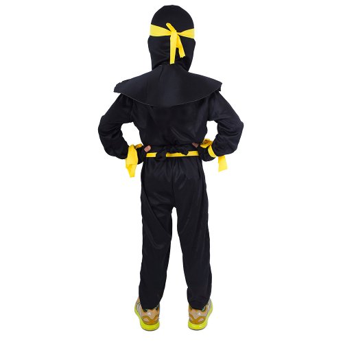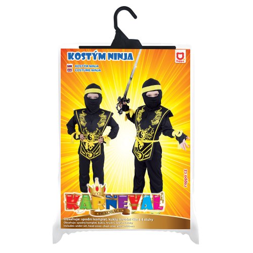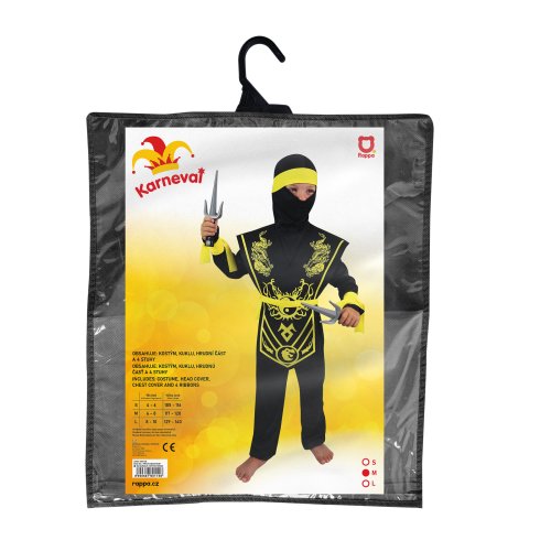 Karnevalový kostým ninja vo veľkosti M je určený pre chlapcov vo vekovom rozmedzí 6-8 rokov (116-128 cm). Balenie obsahuje overal, vestu zdobenú žltými bojovnými motívmi, kuklu, čelenku, opasok a opasky na ruku.