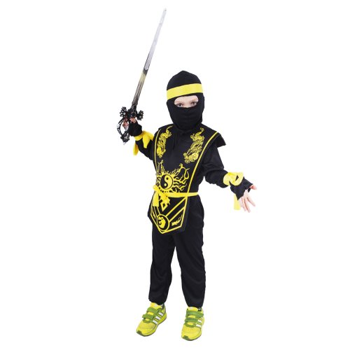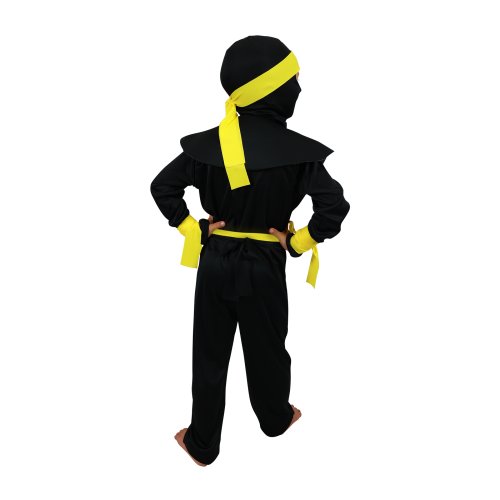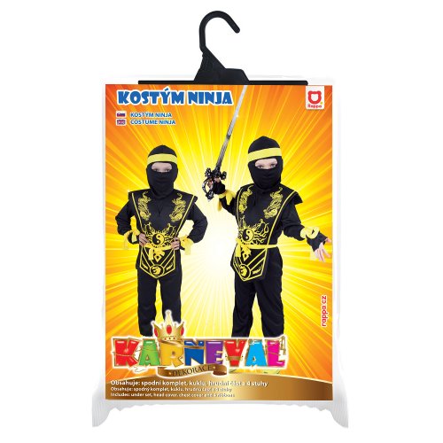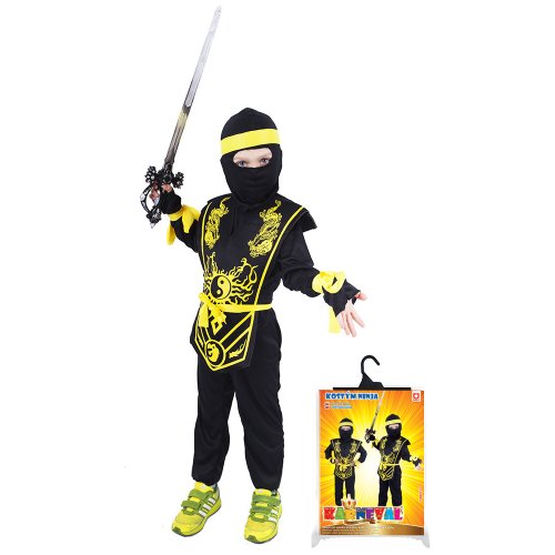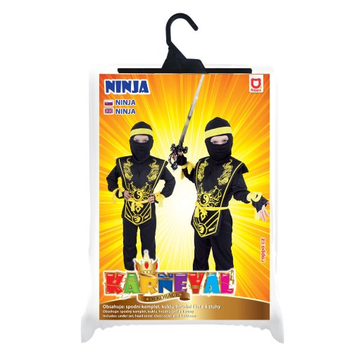 Karnevalový kostým ninja vo veľkosti S je určený pre chlapcov vo vekovom rozmedzí 4-6 rokov (105-116 cm). Balenie obsahuje overal, vestu zdobenú žltými bojovnými motívmi, kuklu, čelenku, opasok a opasky na ruku.