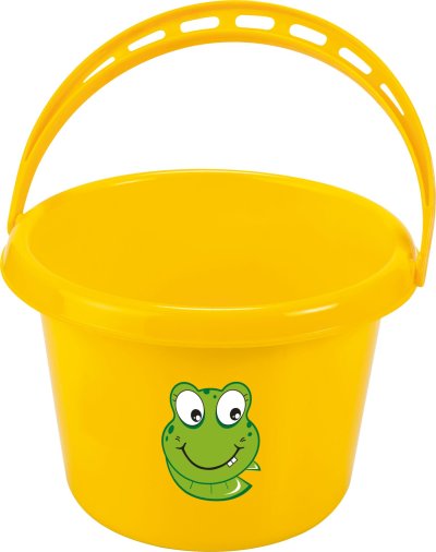 Detský plastový kýblik v žltej farbe s obrázkom s detským motívom.