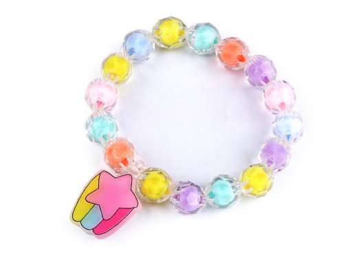 Pôvabný detský náramok s ozdobou poteší všetky malé parádnice. Náramok je vyrobený z plastových korálikov navlečených na pružnej gumičke. Pohodlne sa navlieka na ruku. Ozdoba je plochá, má rôzny motív. Voľne položený vnútorný obvod náramku meria 14 cm. Náramky sú na papierovej karte, ktorá má otvor na zavesenie na predajný stojan.