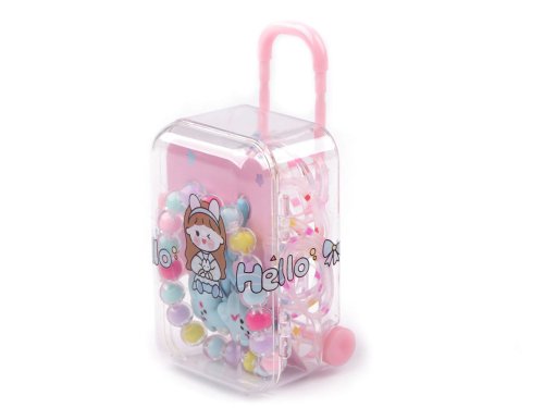Súprava detského náramku, pukačiek a gumičiek do vlasov je ideálna pre dievčatká, ktoré sa rady parádia. Všetko je uschované v otváracom plastovom boxe v tvare pojazdného kufra. Sada obsahuje pružný náramok z plastových korálikov, 2 pukačky s ozdobami a 40 gumičiek. Box je transparentný, má pojazdné kolieska a vysúvacie madlo ako skutočný kufor.