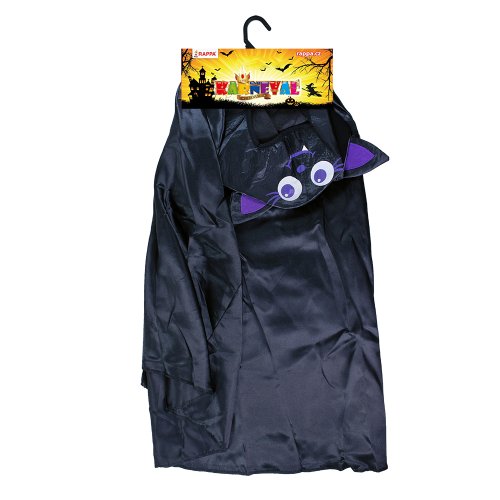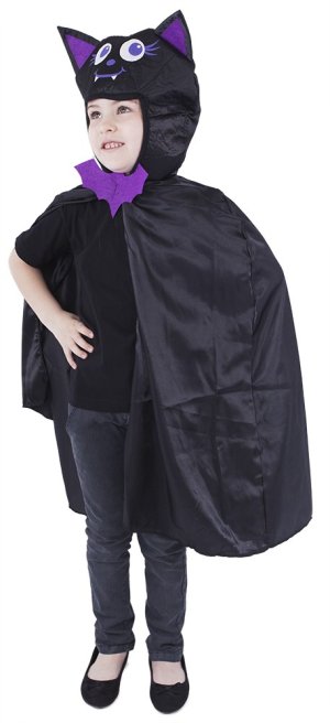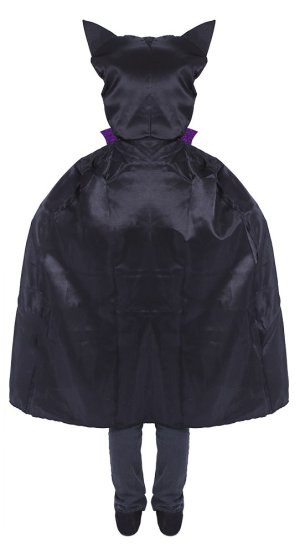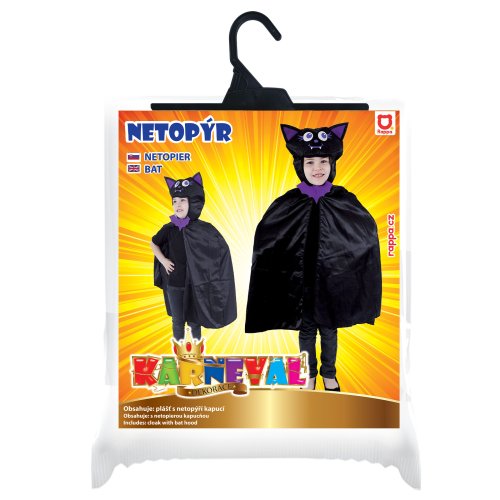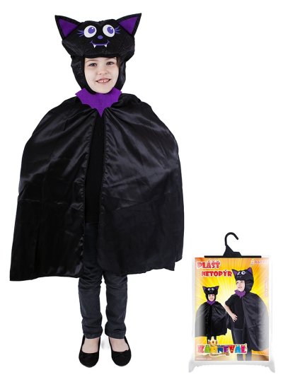 Roztomilý karnevalový kostým napríklad aj na Halloween párty s motívom netopiera v čierno-fialovej farbe av univerzálnej veľkosti je určený pre deti vo vekovom rozmedzí 3-10 rokov (104-150 cm). Balenie obsahuje plášť s kapucňou.