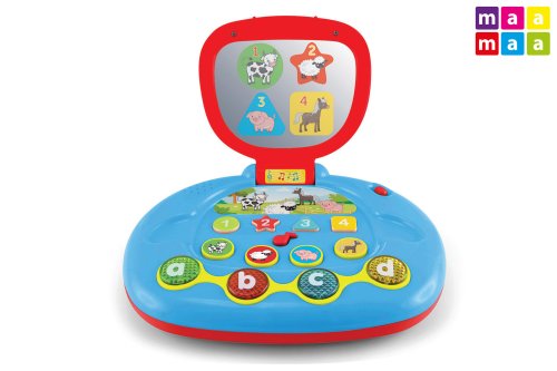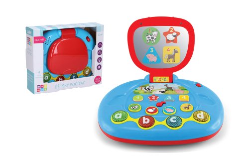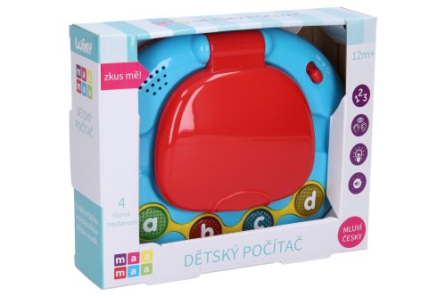 Detský počítač - hovorí po česky. Rozmery 20x16 cm. Svetelné a zvukové efekty. 3xAA batérie súčasťou. Premietanie (displej) v zrkadle. Prepínač - vypnuté, nižšia, vyššia hlasitosť. Výučba čísel, farieb, písmen, tvarov, zvuky zvieratiek, melódie (nota).
