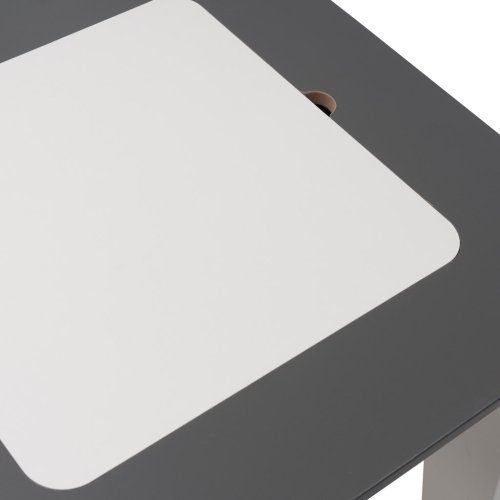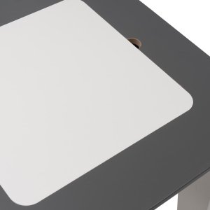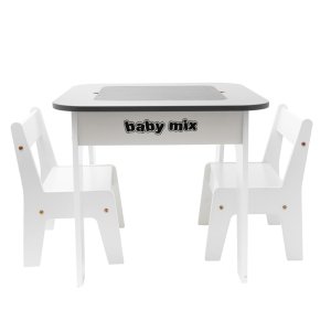 Súčasťou setu je stôl s dvoma stoličkami vyrobený z odolného materiálu, ktorý zaisťuje stabilitu a dlhú životnosť. Stôl je vybavený praktickou odnímateľnou doskou - pod ňou sa nachádza úložný priestor, kam možno ľahko schovať pastelky, papiere, drobné hračky alebo stavebnice. Deti tak majú potrebné veci vždy po ruke a zároveň udržujú poriadok.