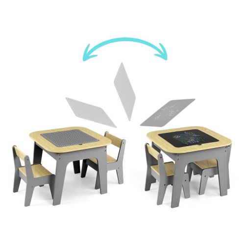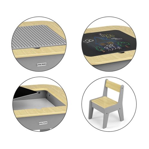Set Olaf Blocks vyniká jedinečnou doskou stola - jedna strana je prispôsobená pre stavebné kocky , čo z neho robí ideálnu základňu pre stavanie. Druhá strana je hladká a perfektná pre kreslenie, písanie alebo iné výtvarné aktivity . Doska je odnímateľná a pod ňou sa nachádza priestranný úložný priestor, ktorý uľahčuje ukladanie hračiek, kociek alebo výtvarných potrieb, čo pomáha udržiavať poriadok.