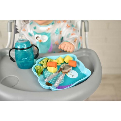 Predstavujeme plastový tanier AKUKU. Bol navrhnutý tak, aby svojimi tvarmi a farbami motivoval dieťa k samostatnosti pri jedle. Je vyrobený z bezpečných materiálov určených na styk s potravinami. K dispozícii v dvoch prevedeniach - slon a sova.