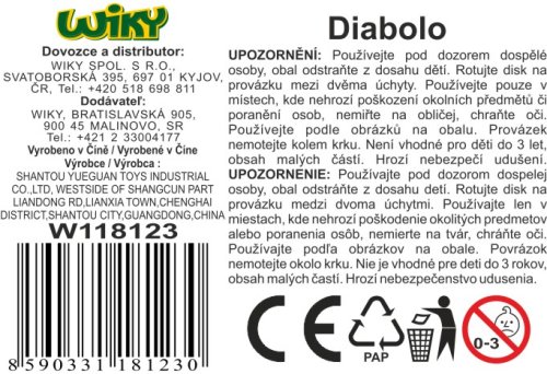 Diabolo - zábavná hra nielen pre deti! Roztoč diabolo pomocou paličiek! Dôležité je mať natiahnuté povrázky! Diabolo môžeš vyhadzovať, chytať a vykonávať množstvo ďalších kúskov, ktoré sa naučíš! Pri hre si precvičíš svoju šikovnosť, motorickú zručnosť a trpezlivosť. Veľkosť: 35 cm (paličky). Rozmery balenia 18 x 43 x 12 cm. Vhodné pre deti od 3 rokov.