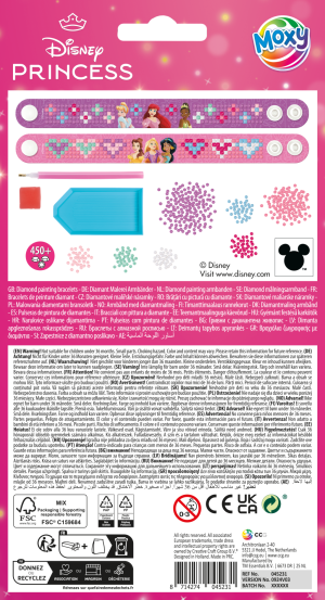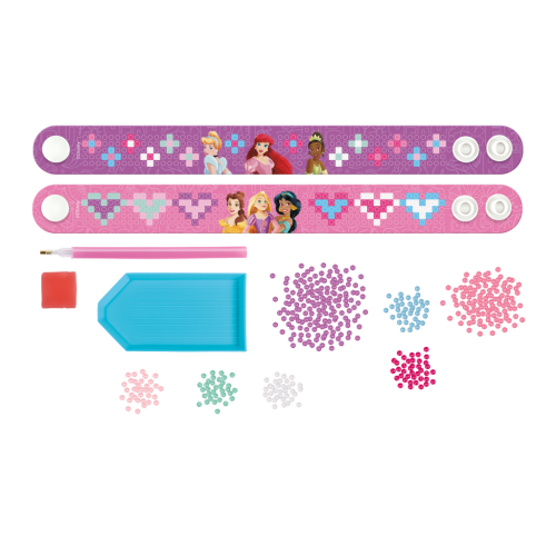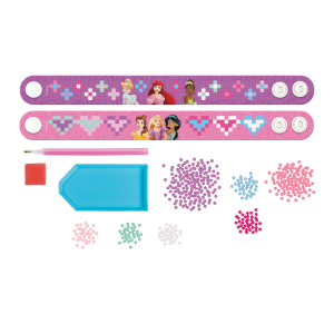 Vytvor si svoje vlastné žiarivé náramky s motívom Disney Princezen s pomocou diamantového maľovania! Táto zábavná kreatívna súprava obsahuje všetko potrebné na ozdobenie dvoch originálnych náramkov trblietavými kamienkami. Skvelá aktivita pre deti i dospelých, ktorá podporuje fantáziu a jemnú motoriku. Súčasťou balenia aplikátor, dva ks náramkov, šanón, vosk a farebné kamienky.