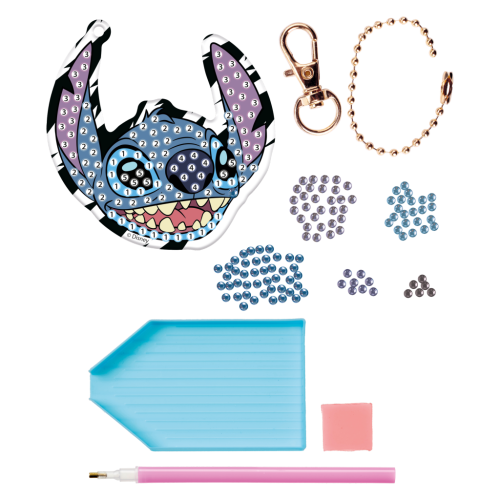 Vytvor si vlastnú trblietavú kľúčenku s obľúbenými hrdinami z filmu Stitch! Sada obsahuje všetko potrebné na to, aby si si pomocou diamantového maľovania ozdobil kľúčenku a dodal jej kúzelný lesk. Skvelý darček a kreatívna zábava pre všetkých malých fanúšikov Stitche! Balenie obsahuje šablónu kľúčenky, aplikátor, triedič na kamienky, retiažku, karabínku a diamanty.
