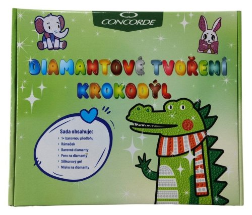 Diamantové tvorenie s motívom krokodíla obsahuje farebnú predlohu, biely rámček, farebné diamanty, pero na aplikáciu diamantov, silikónový gél a misku. Po odlepení priehľadnej ochrannej fólie zo šablóny sa pomocou aplikačného pera a silikónového gélu nanášajú diamanty na zodpovedajúce miesta. Tvorenie podporuje jemnú motoriku, trpezlivosť a rozvíja kreativitu. Hotový obrázok v rámčeku sa stane krásnou dekoráciou.