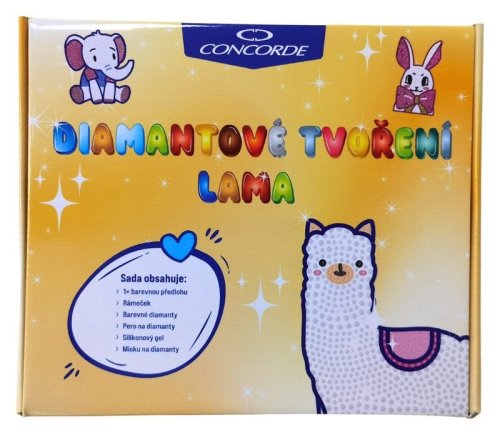 Diamantové tvorenie s motívom lamy obsahuje farebnú predlohu, biely rámček, farebné diamanty, pero na aplikáciu diamantov, silikónový gél a misku. Po odlepení priehľadnej ochrannej fólie zo šablóny sa pomocou aplikačného pera a silikónového gélu nanášajú diamanty na zodpovedajúce miesta. Tvorenie podporuje jemnú motoriku, trpezlivosť a rozvíja kreativitu. Hotový obrázok v rámčeku sa stane krásnou dekoráciou.