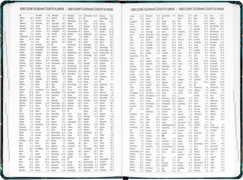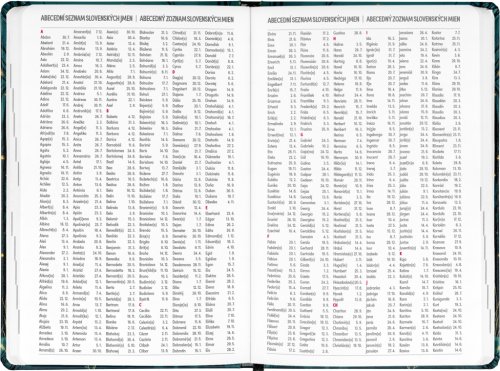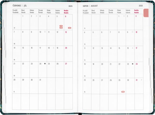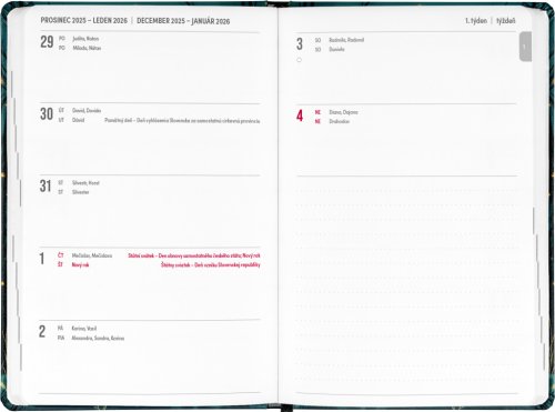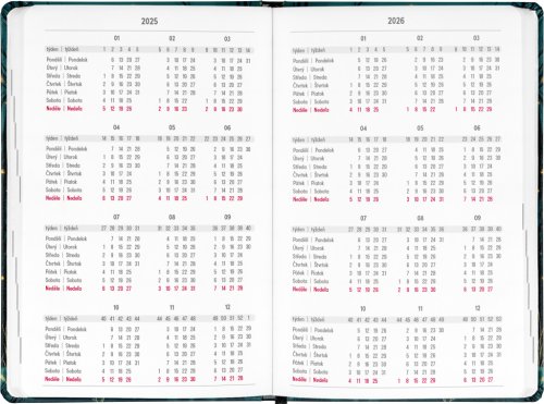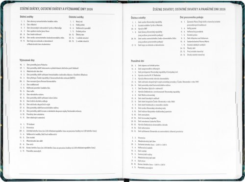 Osemnásťmesačný diár obsahuje prehľad na rok 2025 a 2026, zoznam českých a slovenských mien, česko-slovenské týždenné riadkové kalendárium s menami a sviatkami a priestor na poznámky. Kalendárium začína v júli 2025 a končí v decembri 2026.
