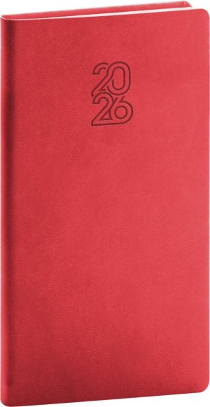 Vreckový diár Aprint 2026 v červenej farbe. Kolekcia stavila na osvedčené farby, ktoré dopĺňa nová razba letopočtu. Týždenný rozvrh s česko-slovenským kalendáriom a doplnkovou angličtinou, nemčinou, maďarčinou a ruštinou. br br • kalendárium od decembra 2025 br • ročný plánovací kalendár 2026 – 2027 br • pracovný plánovací kalendár br • sviatky Českej a Slovenskej republiky a medzinárodné sviatky br • rozšírený zoznam českých mien br • miesto pre osobné údaje br • perforované rožky br • priestor pre poznámky. br