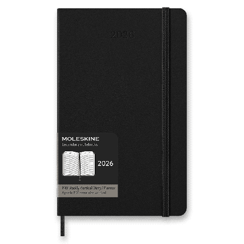 Čierny profesionálny diár veľkosti L na rok 2026.