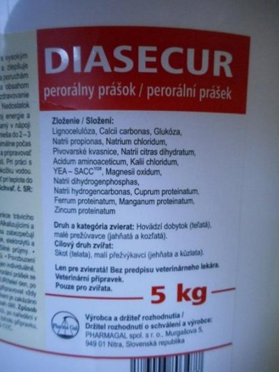 Zloženie veterinárneho prípravku: Lignocelulóza, Calcii carbonas, Glukóza, Natrii propionás, Natrium chloridum, Pivovarské kvasnice, Natrii citras dihydratum, Acidum aminoaceticum, Kalii chloridum, YEA – SACC1026, Magnesii oxidum, Natrium oxidum, Natriu inatum, Ferrum proteinatum, Manganum proteinatum, Zincum proteinatum Charakteristika: Dietetický prípravok s vysokým obsahom vlákniny pomáhajúci optimalizovať funkcie tráviaceho systému. Pomáha eliminovať choroboplodné zárodky v tráviacom trakte a zlepšuje konzistenciu výkalov. Alkalizujúcimi a neutralizačnými látkami ako aj pivovarskými kvasnicami predchádza poruchám trávenia. Probiotiká zabezpečujú osídlenie tráviaceho traktu žiaducimi mikroorganizmami a obsahom organicky viazaných minerálnych látok, elektrolytov a glukózy nahrádza deficit látok potrebných na uzdravovanie hnačkových teliat.