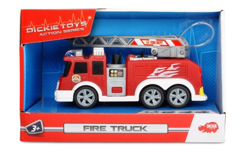 Hasičské auto na voľnobeh, svetelný a zvukový efekt. Striekačka na vodu manuálna, pohyblivý rebrík. Dĺžka auta 15 cm.