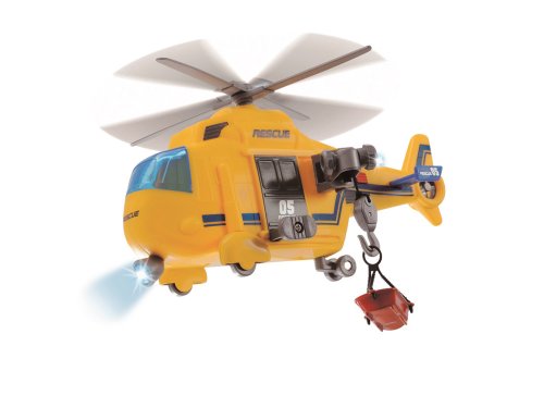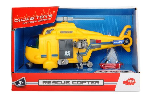 Záchranársky vrtuľník so zvukovým a svetelným efektom, na voľnobeh. Manuálne ovládaný navijak. Dĺžka 18 cm.