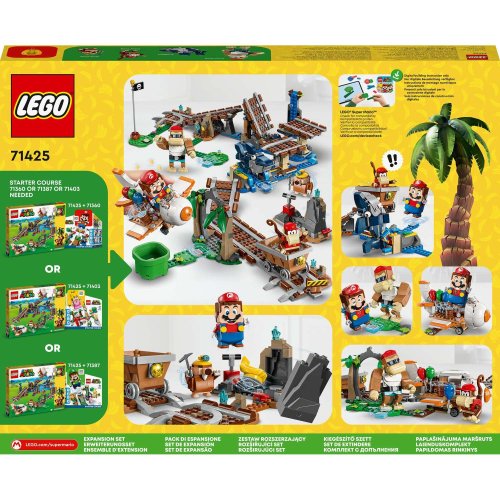 Postavte kultovú úroveň s Donkey Kongom vo svete LEGO® Super Mario™ z kociek s týmto rozširujúcim setom Diddy Kongova jazda v banskom vozíku (71425). Posaďte figúrku LEGO® Maria, LEGO® Luigiho alebo LEGO® Peach™ (nie sú súčasťou balenia) do banského vozíka a jazdite s ňou po trati. Odstrčte Snaggles z cesty, opravte rozbitú časť trasy, porazte Mole Minera a nechajte „vybuchnúť“ skalu, v ktorej sa ukrývajú banány k „jednu“ alebo ako darček pre Funky Konga alebo Diddy Konga. Kúpte si balóniky z lietadlového obchodu a „preleťte“ sa lietadlom, aby ste získali viac digitálnych mincí. Poznámka: Pre interaktívny herný zážitok je potrebný niektorý zo štartovacích setov 71360, 71387 alebo 71403.