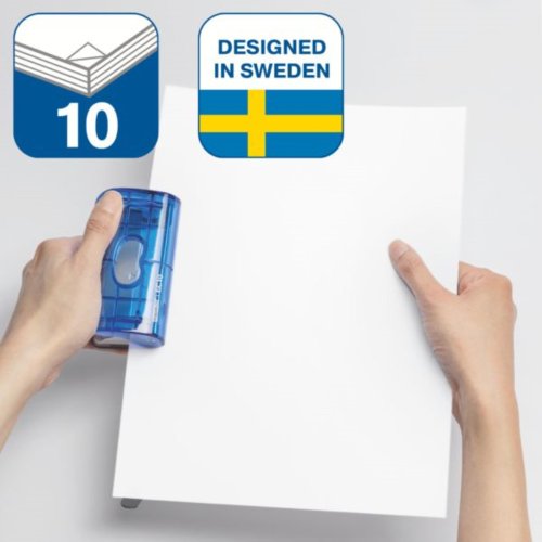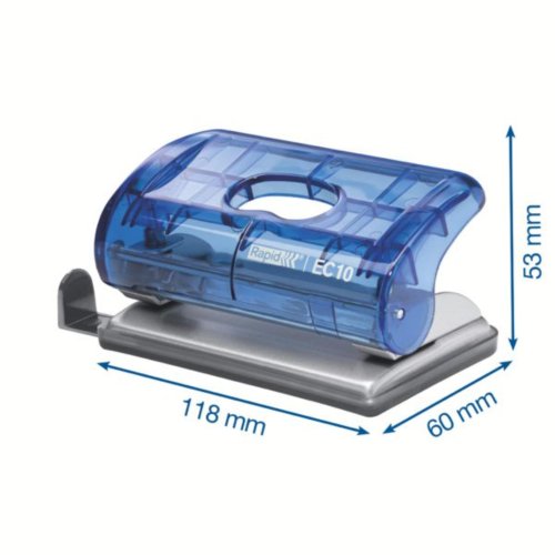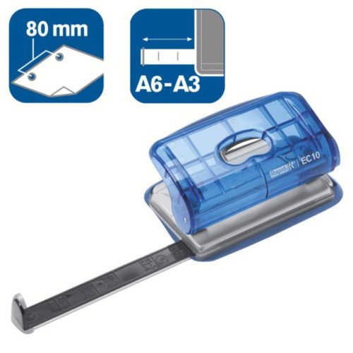 Kovový mini dierovač s ramenom a základňou z vystuženého plastu ABS Príložník pre všetky štandardné formáty A4, A5, A6 Rozmery: 7,6 x 4,3 x 11,0 cm (š xvxh) Výkon 10 listov Záruka 5 rokov