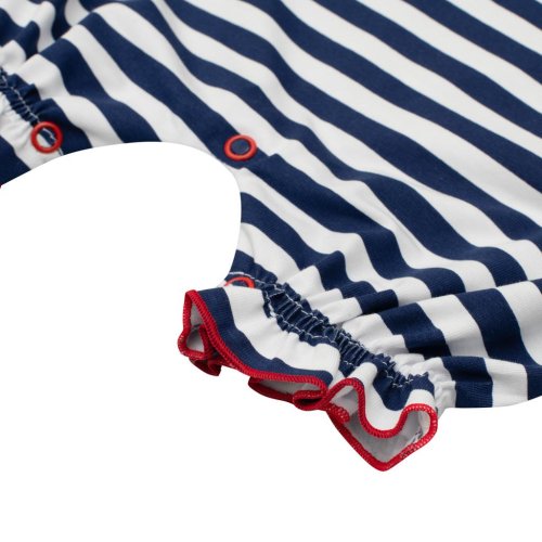 Letný bavlnený overal s krátkym rukávom českej značky New Baby Marine. Overal s krátkym volánikovým rukávom celopotlačený modernými pruhmi s nášivkou kotvy. Nášivka je podlepená látkou proti poškriabaniu. Má praktické zapínanie na cvočky na ramienku a medzi nožičkami, čo uľahčí obliekanie a prebaľovanie. Super štýlový letný motív rozžiari každé bábätko. Zloženie: 100% bavlna.