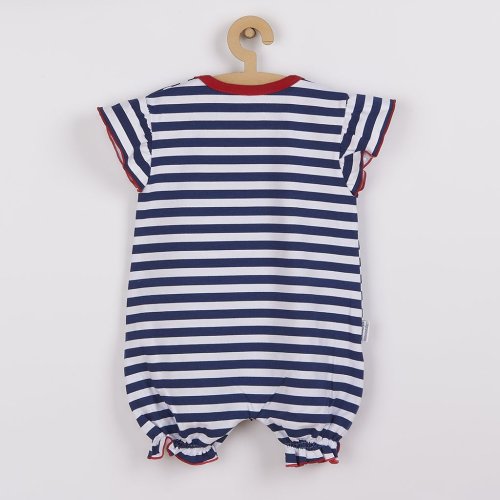 Letný bavlnený overal s krátkym rukávom českej značky New Baby Marine. Overal s krátkym volánikovým rukávom celopotlačený modernými pruhmi s nášivkou kotvy. Nášivka je podlepená látkou proti poškriabaniu. Má praktické zapínanie na cvočky na ramienku a medzi nožičkami, čo uľahčí obliekanie a prebaľovanie. Super štýlový letný motív rozžiari každé bábätko. Zloženie: 100% bavlna.