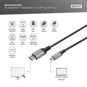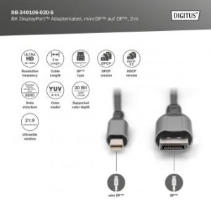 Kábel adaptéra Digitus® 8K DisplayPort verzia 1.4 Mini DP na DP už spĺňa požiadavky na budúce zariadenia s vysokým rozlíšením (TV, projektor, monitor) novej generácie. Dokonalý zážitok v rozlíšení 8K s rozlíšením Ultra-HD II až 7680 ×