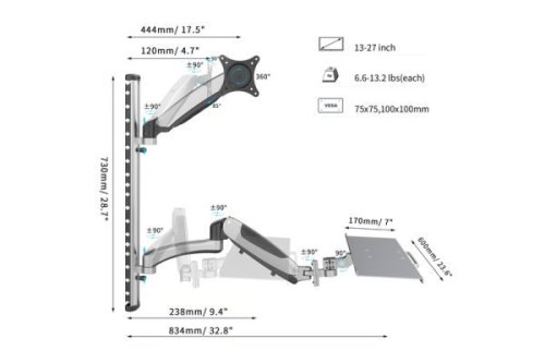 Univerzálny nástenný držiak s flexibilným nastavením pracovnej výšky na montáž monitorov a klávesníc. Nastavte pracovný priestor, ktorý môžu používať ľudia rôznych výšok – pracovnú výšku môžete ľahko nastaviť pomocou dvoch rýchlych pohybov. Jednoducho si všimnite veľkosť VESA a hmotnosť monitora, aby ste mohli vybrať vhodný držiak.