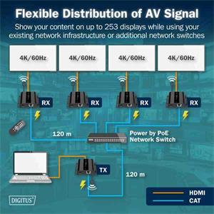 Sada HDMI IP Extender, 4K/60Hz umožňuje prenos HDMI AV signálov v ultra vysokom rozlíšení 4K (4096x2160p pri 60Hz) na veľké vzdialenosti až 200 metrov - vďaka výkonnému point-to-point pripojeniu cez sieťový kábel CAT6 alebo vyšší. Sada je plne napájaná cez sieťový prepínač PoE, nie sú potrebné žiadne externé napájacie zdroje. Rozšírenie cez IP umožňuje flexibilné škálovanie systému a podporuje až 253 prijímačov (displejov) pre point-to-multipoint prenos. Okrem toho je možné využiť existujúcu sieťovú infraštruktúru 1G, čo umožňuje neobmedzený dosah signálu vďaka kaskádovaniu cez sieťové prepínače. Pre ešte väčšiu flexibilitu sú samostatne k dispozícii ďalšie prijímače (RX) (model: DS-55354). Vynikajúca kvalita obrazu je vždy zachovaná: Vďaka nízkej latencii iba 150-220 ms je prenos plynulý a ostrý v UHD. Ďalšou praktickou funkciou je integrované IR rozhranie, ktoré umožňuje diaľkové ovládanie vstupného zdroja priamo z výstupnej obrazovky. Zariadenie je tiež vhodné na montáž na stenu, čo umožňuje priestorovo úspornú inštaláciu. Ideálna pre profesionálne AV aplikácie, domáce kiná alebo použitie vo firmách – táto sada HDMI IP extenderov kombinuje najvyššiu kvalitu prenosu s maximálnou flexibilitou.