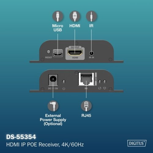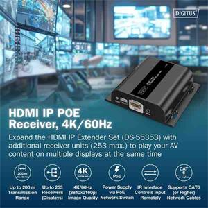 Rozšírte svoj existujúci HDMI IP extender (DS-55353) o ďalšie prijímače a preneste svoj AV obsah až na 253 displejov súčasne – ideálne pre digitálnu signalizáciu, konferenčné miestnosti alebo rozsiahle prezentácie. Vďaka prenosu signálu založenému na IP cez existujúcu sieťovú infraštruktúru 1G alebo ďalšie sieťové prepínače 1G môžete distribuovať obsah flexibilne a na neobmedzené vzdialenosti. Možnosť kaskádovania zabezpečuje maximálnu škálovateľnosť a jednoduchú integráciu do vášho systému. Prijímač je napájaný cez sieťový prepínač PoE, nevyžaduje sa žiadny externý zdroj napájania, čo umožňuje flexibilnú inštaláciu. Užite si ostrý obraz v rozlíšení UHD až 4K/60Hz (4096x2160p) s minimálnou latenciou len 150–220 ms. Integrované IR rozhranie umožňuje diaľkové ovládanie vstupného zdroja priamo z výstupnej obrazovky, čo vám umožňuje pohodlne spravovať váš obsah. Pre stabilné a spoľahlivé pripojenie odporúčame použitie sieťových káblov CAT6 alebo vyššej kvality. Prijímač je vhodný aj na montáž na stenu, čo umožňuje priestorovo úspornú inštaláciu. Zvýšte efektivitu svojho AV riešenia s HDMI IP prijímačom 4K/60Hz – pre pôsobivú kvalitu obrazu a maximálnu flexibilitu.