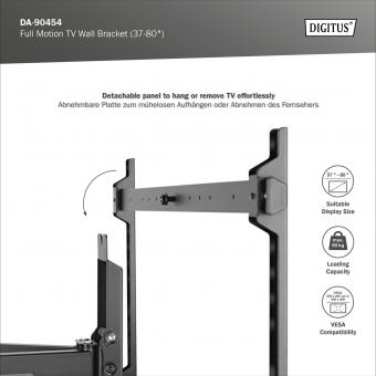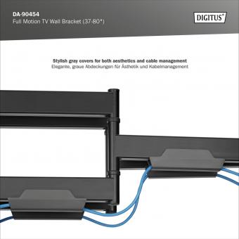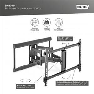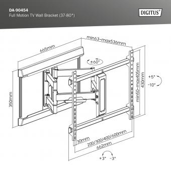 Nástenný držiak DIGITUS® pre displeje s držiakom VESA od 37 do 80" ponúka pohodlnú a flexibilnú možnosť upevnenia TV/monitora na stenu. S maximálnou nosnosťou 60 kg je tento držiak schopný bezpečne držať väčšie displeje bez straty stability. Vďaka výsuvnému prevedeniu od 6,3 do 53,6 cm môžete svoj displej vždy uviesť do ideálnej polohy a zvoliť tak ideálny pozorovací uhol.Či už chcete displej nakloniť, aby ste zabránili oslneniu, alebo ho otočiť do strany, aby ste dosiahli najlepší možný zážitok zo sledovania: tento nástenný držiak ponúka bezproblémové riešenie Displej je možné otáčať od +60 do -60 ° a nakláňať od +5 do -10 ° Horizontálne nastavenie (rotácia) od +3 do -3 ° umožňuje presné zarovnanie displeja a zabezpečenie jeho dokonalej polohy.Ramená držiaka môžete tiež jednotlivo posunúť na stranu na trvalo namontovanej nástennej nosnej doske a uzamknúť ich v požadovanej polohe, aby ste dosiahli optimálny zážitok zo sledovania.Vďaka integrovanému vedeniu káblov je nástenný držiak tiež esteticky príťažlivý a zabraňuje neusporiadanému zmätku káblov.