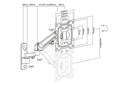 Náklon: -5°/+15°, Otočenie: -90°/+90°, Rozsah otáčania predného panelu: -3°/+3°