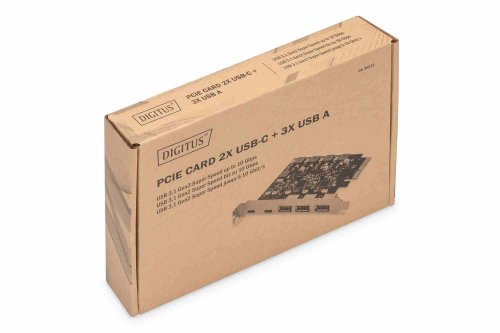 Digitus PCI Express Card rozširuje PC o 2x USB-C a 3x USB A port. K tejto karte je možné pripojiť rôzne zariadenia, ako sú pevné disky, DVD mechaniky, myš, klávesnica, čítačka kariet a ďalšie.