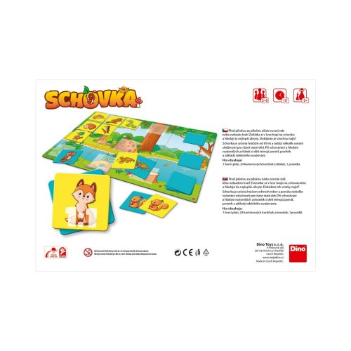 V kartičkovej hre Schovka sa schováva poriadna zábava. Hlavným cieľom je nazbierať, čo najviac kartičiek zvieratiek, ktoré sú ale dômyselne ukryté. Obsah balenia: 1 herný plán24 kartónových kartičiek zvierat1 herný plán Hlavné vlastnosti: vhodné od 3 rokov veku rozvíja predstavivosť, strategické myslenie precvičuje jemnú motoriku podporuje kreativitu a predstavivosť vyrobené v ČR