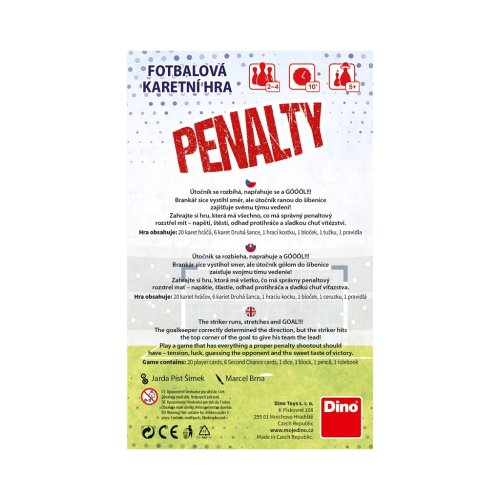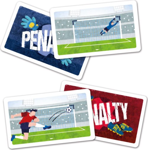 Útočník sa rozbieha, naťahuje sa a GÓÓÓL!!! Brankár síce vystihol smer, ale útočník ranou do šibenice zaisťuje svojmu tímu vedenie! Zahrajte si hru, ktorá má všetko, čo má správny penaltový rozstrel mať – napätie, šťastie, odhad protihráča a sladkú chuť víťazstva. Hra obsahuje: 20 kariet hráčov, 6 kariet Druhá šanca, 1 hraciu kocku, 1 bloček, 1 pravidlá, Vek: 5+