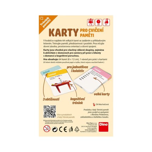 Objavte kúzlo spoločne strávených chvíľ, kedy sa budete baviť a rozvíjať svoje schopnosti. Hra je vhodná pre všetky vekové skupiny od detí po seniorov. 64 veľkých kariet s originálnymi úlohami a návrhmi riešení sú navrhnuté pre aktívny tréning pamäte, predstavivosti, slovnej zásoby, postrehu aj priestorovej orientácie. Sú ideálnym pomocníkom pre opatrovateľov v domovoch pre seniorov, pri práci s ľuďmi trpiacimi demenciou či kognitívnym oslabením, ale aj pre rodiny, ktoré chcú zmysluplne tráviť čas so svojimi deťmi, rodičmi a starými rodičmi. Každá karta prináša jednoduché nápadité aktivity, ktoré poskytujú vodítko, podporujú komunikáciu a inšpirujú k spoločným činnostiam. Pravidelné precvičovanie mozgu napomáha lepšej orientácii v každodennom živote, udržuje mentálnu kondíciu a prispieva k dobrej nálade. Obsah balenia: 64 kariet návod k hre Hlavné vlastnosti: trénuje pamäť, predstavivosť, postreh, slovnú zásobu a priestorovú orientáciu vhodné seniorov a osoby s demenciou a kognitívnymi poruchami vhodné pre deti od 6 rokov texty na kartičkách v češtine