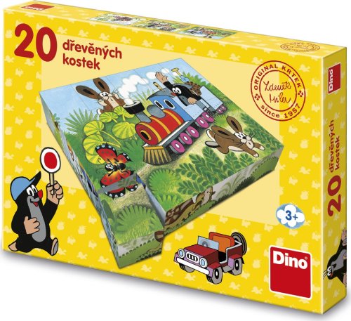 Detské drevené kocky (kubusy) s Krtkom. Obrázkové kocky podporujú u najmenších detí koordináciu a motoriku pri búraní a stavaní komínov, napomáhajú chápaniu príčiny a následku. U starších detí pri skladaní obrázkov rozvíja fantáziu a logické myslenie a motivujú k rozprávaniu príbehov. 6 obrázkov - 20 kociek balených v kartónovej krabičke. Drevené obrázkové kocky DINO sú vyrobené zo zdravotne nezávadných materiálov, spĺňajú požiadavky dané európskou normou na bezpečnosť hračiek STN EN 71-1 a sú atestované v SR.