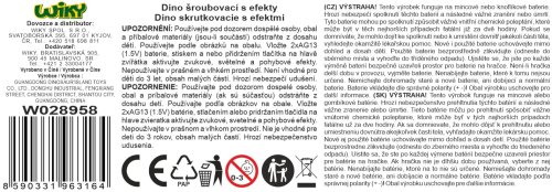 Dino skrutkovacie s efektmi tyranosaurus. Rozmery 12,5x5,5x13 cm. Dinosaurus po stlačení hrebienku na hlave otvára papuľu a guľou očami, pri pridržaní svieti. Vydáva zvuky. 2xAG13 batéria súčasťou balenia.