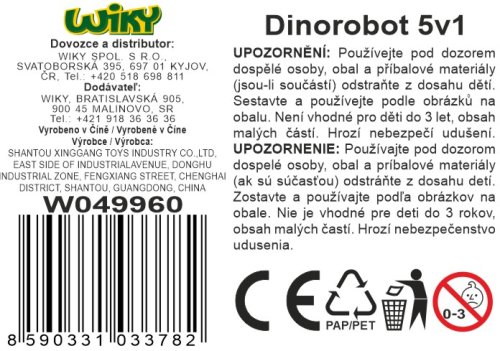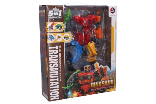 Dinorobot 5v1 set. Veľkosť 26 cm. Veľký dinosaurie robot, ktorý sa skladá z 5 menších robotov. Transformujú sa na dinosaurami. Návod na zloženie na zadnej časti obalu.